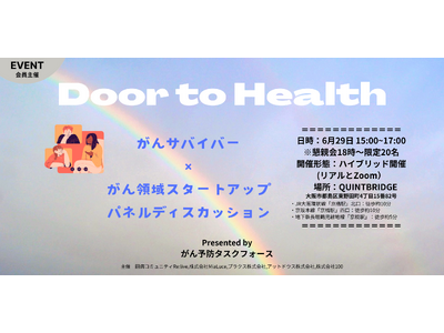 がんサバイバー、がん領域スタートアップ有志により結成された「がん予防タスクフォース」は、2024年6月29日(土)15時~17時、QUINTBRIDGE(大阪市都島区東野田町4丁目15−82)にて、がんになった当事者の話に加え、がん領域スタートアップの取り組みについて知るきっかけのイベント「Door to Health」を開催しました。