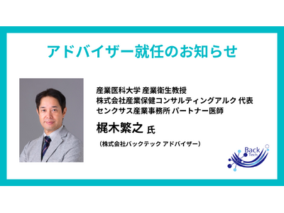 梶木繁之氏(産業医科大学 産業衛生教授、株式会社産業保健コンサルティングアルク 代表、センクサス産業事務所 パートナー医師)がバックテックのアドバイザーに就任したことをご報告いたします。