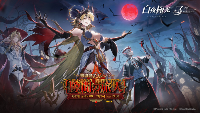 幻想的かつユニークなストーリー、美麗なグラフィック、豪華声優陣による個性豊かなキャラクター等で話題となり、ローンチとともにApp StoreとGoogle Playでランキング1位※に輝いた『白夜極光(びゃくやきょっこう)』。7月4日(木)には、3周年を記念するアニバーサリーアップデートが導入され、様々な特典と期間限定イベント【隙間の旅人】が楽しめます。3周年を迎えてますます盛り上がりを見せる『白夜極光』。怒涛のアニバーサリーイベントを存分にお楽しみください!