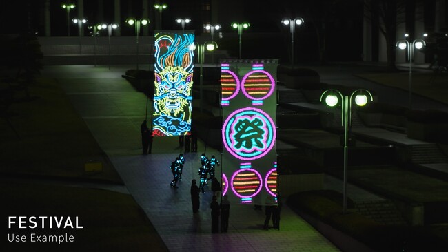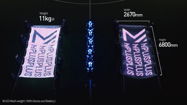 エムプラスプラス株式会社は、制御デバイス・バッテリーを含め約11kgという軽さを誇る新しい布LEDディスプレイ「LED MEGA MESH」を発表いたします。この製品は、2023年に発表された「LED VISION DRONE」を基に開発されました。「LED VISION DRONE」は、縦6.8m横2.6m、重量約11kgの布LEDディスプレイをドローンの機体下部に搭載し、阪神タイガースの「ウル虎の夏 2023」などで使用されました。