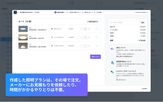 作成した照明プランは、その場で注文することができます。メーカーにお見積もりを依頼したり、時間がかかるやりとりはが不要になります。 また、設計の変更や予算管理などのために器具数を途中で修正したい場合は、リアルタイムでカートに反映することができます。明るさの検証を行いながら自由自在に 照明設計を進め管理することができます。