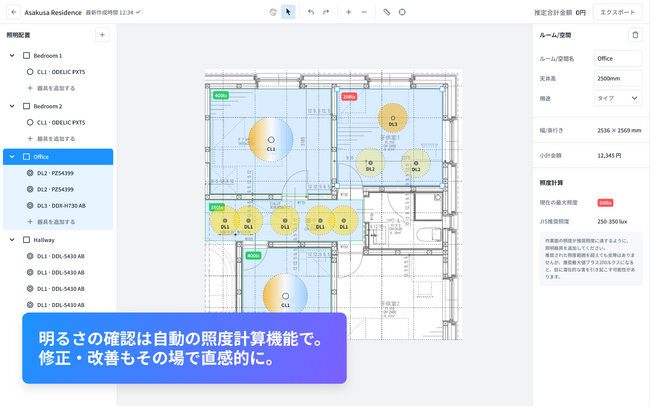選択した照明を、画面上にドラッグ&ドロップでレイアウトしていきます。明るさの確認は自動の照度計算機能で確認。修正・改善もその場で直感的に行えます。
