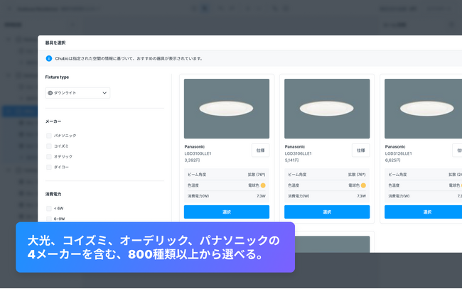 ログインして平面図をアップロードすると、空間(部屋別)の目的にあった照明をフィルター検索することができます。また、「おすすめ」のセクションではCHUBICがその空間のタイプ、サイズ、天井 の高さなどに合った最適な照明を自動でレコメンドしてくれ る機能も搭載しています。大光、コイズミ、オーデリック、パナソニックの4メーカーを含む、800種類以上のシーリングライト、ダウンライト、スポットライト、ペンダントライトの中からお選びできます。 更に今後はリニアライト等も順次追加予定となっております。