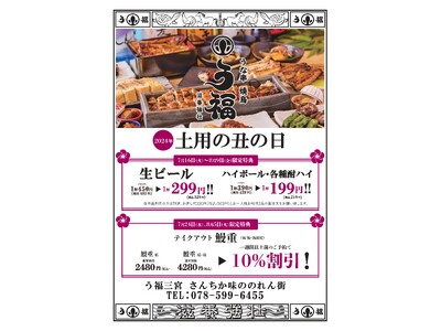 2023年4月オープン以来、ご好評頂いております【う福三宮 さんちか味ののれん街】(運営:株式会社シーズン2、本社:東京都渋谷区)は、昨年に引き続き土用の丑の日に合わせお得なキャンペーンを開催させて頂きます。