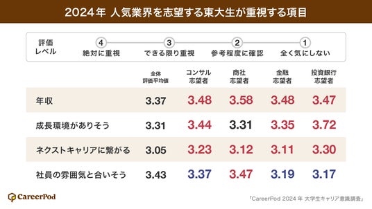 一方、人気の高い4業界(コンサル・商社・金融・投資銀行)の志望者に限ると、全体では評価の高かった「社員の雰囲気と合いそう」という項目が、商社志望者以外で全体平均を大きく下回った一方、「年収」「成長環境がありそう」「ネクストキャリアに繋がる」といった項目の評価レベルが高い傾向にありました。