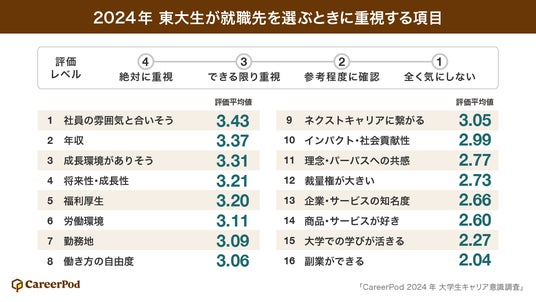 2024年 東大生が就職先を選ぶときに重視する項目(「CareerPod 2024年 大学生キャリア意識調査」より)