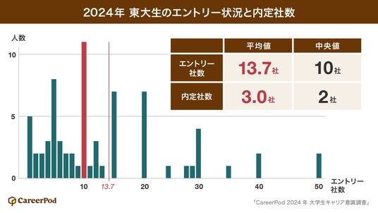2024年 東大生のエントリー状況と内定社数(「CareerPod 2024年 大学生キャリア意識調査」より)
