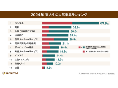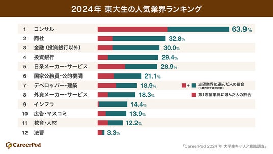 2024年 東大生の人気業界ランキング(「CareerPod 2024年 大学生キャリア意識調査」より)