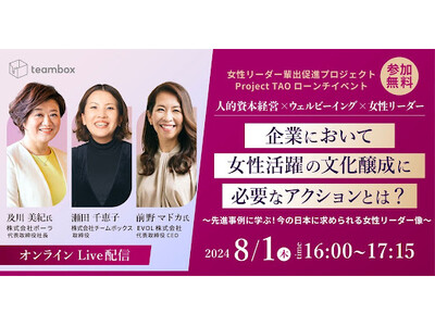 リーダー育成・組織開発・組織文化の専門会社である株式会社チームボックス(東京都港区新橋、代表取締役:中竹竜二 以下、チームボックス)は、女性リーダー輩出促進プロジェクト「Project TAO」の第一弾としてローンチイベントを開催します。