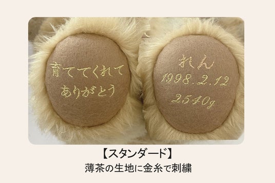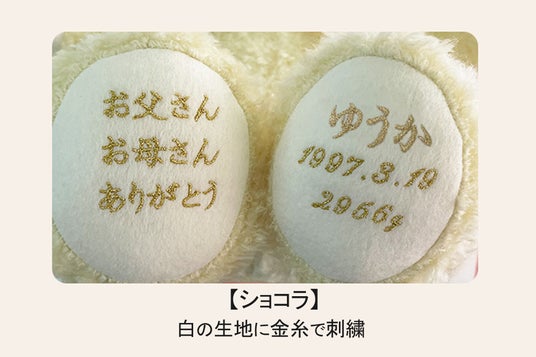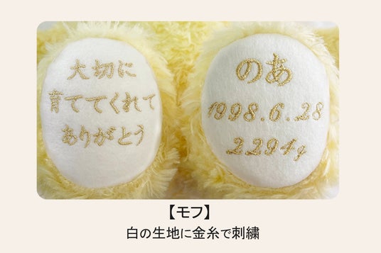 その異なる重さ(体重)を1g単位で再現し、ご希望で、お名前・生年月日、メッセージなどを刺繍することで、長く愛していただける世界で一つだけの宝物になります。