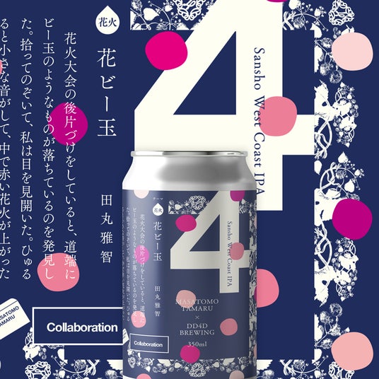 柑橘系ホップの華やかな香りとピリピリとする山椒の余韻で、ドカンと上がり散ってゆく花火を表現しました。ぜひ、缶を手にとって頂き、ショートショート作家、田丸雅智氏とのコラボ「ラベル小説」もお楽しみください。