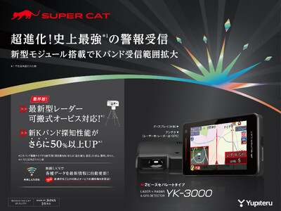 株式会社ユピテル(本社:東京都港区、代表取締役会長兼CEO:安楽憲彦、以下ユピテル)は、新型モジュール搭載でK バンド受信範囲を拡大し、業界で初めて最新型レーダー可搬式オービスに対応したレーザー&レーダー探知機2024 年モデル 無線LAN 搭載 2 ピースセパレートタイプ SUPER CAT 「YK-3000」を7 月下旬より順次発売します。