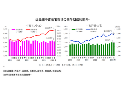 (公社)近畿圏不動産流通機構が7月18日に発表した2024年4~6月期の近畿圏の中古マンション成約件数は、4,183件(前年同期比プラス3.2%)と3期連続で増加し、市場の売り出し(新規登録)件数は16,779件(前年同期比プラス6.2%)となりました。近畿圏の対象12地域中4地域で成約件数が増加し、大阪市は2ケタの高い伸びが続きました。