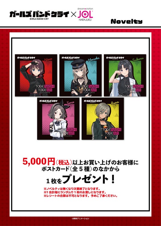 『ガールズバンドクライ POP-UP SHOP』では、1会計毎に5,000円(税込)以上お買い上げのお客様に、ジャケット風ポストカード (全5種)を1枚プレゼントいたします。