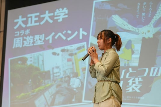大正大学 地域創生学部の学生 加藤里佳子さんが登壇。現在 池袋ミステリータウンとコラボして開発中の「フクロウ像を巡る周遊型ミステリーアトラクション」も、としまミステリーフェスに合わせてリリース予定とのことです。池袋駅東西にはたくさんのフクロウ像が点在しており、これを音声ガイドアプリを使いながら巡るアトラクションだということです。