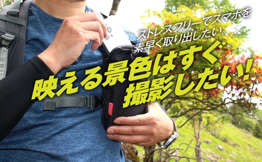 素晴らしい大自然を目の前にして、ついスマホで写真を撮りたくなるのが人情ですが、疲れているとその動作もままならない時があります。そんなとき胸元からスッとスマホが取り出せれば、ストレスフリーで写真撮影が可能です。
