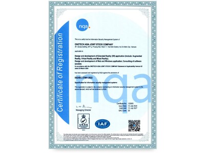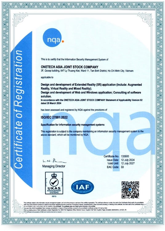 株式会社One Technology Japanは、XR開発企業として、またAWSの開発公式パートナーとして、セキュリティ対策の強化に取り組んでまいりました。この度、当社の開発拠点であるONETECH ASIA JOINT STOCK COMPANYが、2024年7月12日付でISMS(情報セキュリティマネジメントシステム)に関する国際規格ISO IEC 27001 2022の認証を取得しましたことをお知らせいたします。