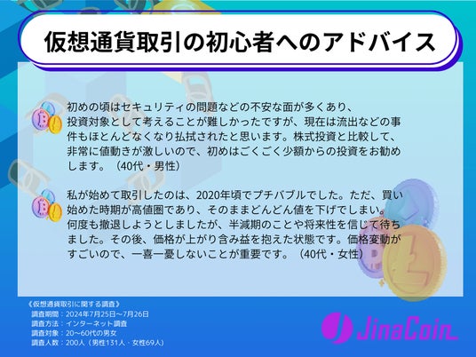 仮想通貨取引の初心者へのアドバイスとしてさまざまなコメントが寄せられました。30代男性は、「仮想通貨の取引はまだまだ歴史が浅く、過去のデータで今後の仮想通貨の価格を予想するのは難しい。」と回答しています。