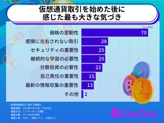 仮想通貨取引を始めた後に感じた最も大きな気づきという質問では、価格の変動性と答えた方が70票、感情に左右されない取引が28票、セキュリティの重要性と継続的な学習の必要性がそれぞれ25票と続きました。