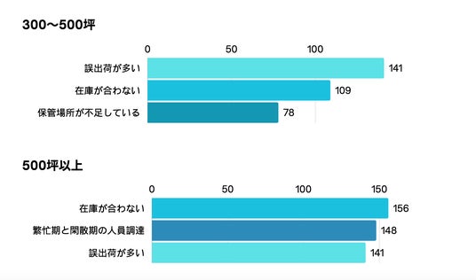坪数の大きさによって上位3つの課題を比較した結果、0~100坪、100~300坪、300~500坪それぞれにおいて重要とされる課題は完全に一致する結果となりました。また、500坪以上になると、「繁忙期と閑散期の人員調整」が2位にランクインする結果となりました。