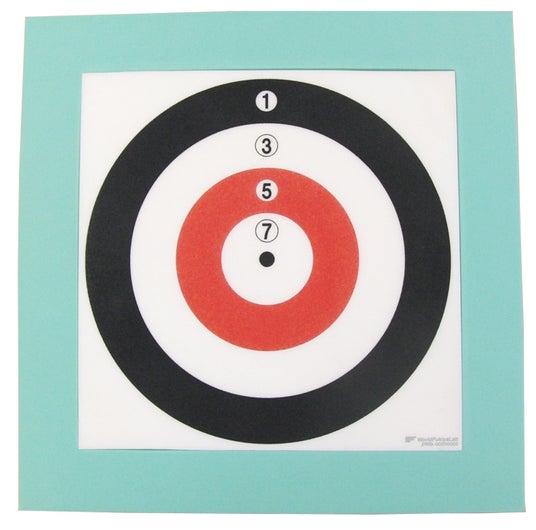 的は中心の白い部分が7点、その外側の赤い部分が5点、その外側の白い部分が3点、さらに外側の黒い部分が1点です。