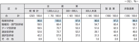 「階層別研修」は96.6%と大多数の企業が実施している