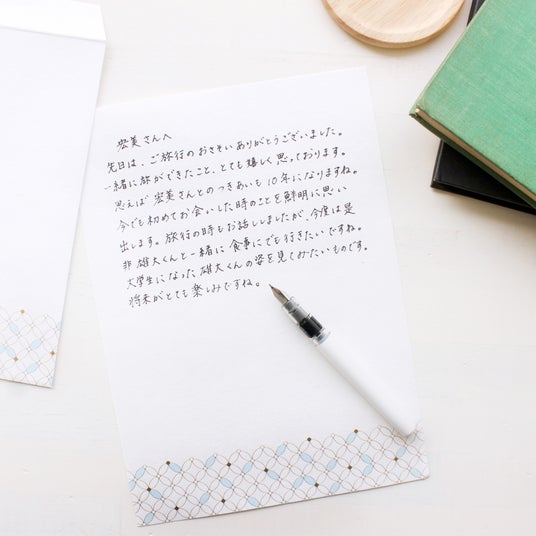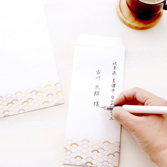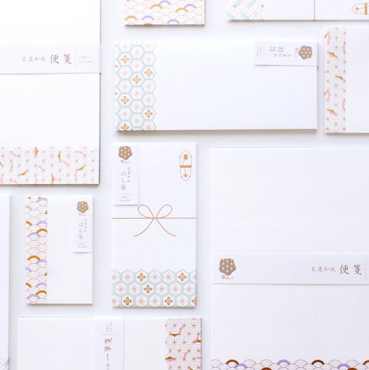 日本の伝統的な吉祥文様「青海波文様」「麻の葉文様」「亀甲文様」「七宝文様」を便箋や封筒の下部に配し、柔らかな色合いとさりげなく施された箔によって、美濃和紙の美しさを保ちつつも上品さをプラスした商品です。便箋にも一筆箋にもお使いいただける封筒を別途ご用意しておりますので、文をしたためたいお好みの便箋、一筆箋をお使いいただき、封筒と共にお手紙をお送りいただけます。