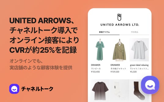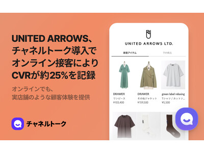 https://channel.io/ja )」(以下「チャネルトーク」)は、株式会社ユナイテッドアローズ(代表取締役 社長執行役員 CEO:松崎 善則、本社所在地:東京都渋谷区)が運営する、公式ECサイト ユナイテッドアローズ オンラインにチャネルトークを導入したことにより、EC・店舗の購買転換率(以下、CVR)が約25%を記録したことをお知らせいたします。