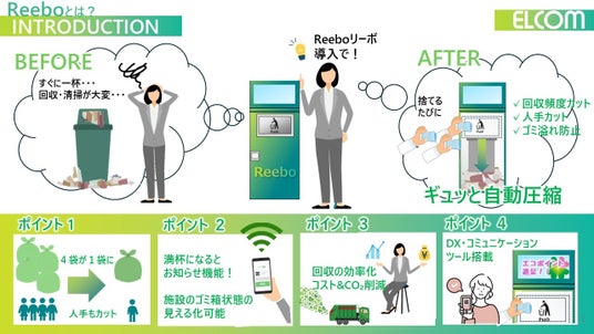 同社は環境機器メーカーとして、ごみの排出における省スペース、省コスト、さらに環境負荷を低減することができる業務用小型ごみ圧縮機の開発を約20年以上に渡り行ってきました。圧縮機PREMO(プレモ)シリーズは、全国の小売店、オフィス、ホテル、工場、学校などで約1500台以上の導入実績があり、これまで、ごみ保管庫などのバックヤードで事業系ごみにおける課題解決の一助を担ってきました。今回は、フロントヤード設置型としてさらに小型化・高機能化に成功。公共施設や商業施設のごみ箱の省人・省力化を図ることができる「Reebo」が誕生。IoTやAIといった最新技術を融合し、より消費者に近い場所で、分別の促進による【リサイクル率の向上】、情報発信による【広告マーケティング】といった複数のソリューションを提供します。