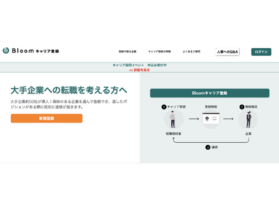 株式会社Bloom(本社:東京都渋谷区、代表取締役:平原俊幸)は、転職を考える個人が大手企業から直接情報提供や個別連絡を受けられるキャリア登録システム「Bloomキャリア登録」を開発・運営しています。2018年9月のサービスリリース以降、大手企業特化型のプロダクトとしてKDDI・トヨタ自動車・三井物産・LINEヤフー・花王など各業界のリーディング企業が続々と導入。各企業の採用ホームページ上の「キャリア登録」ボタンからサービス登録ができ、累計で400名以上が大手企業からの直接連絡をもとに転職を実現しています。「世界を変える大手企業が共に創る、採用の増加と進化」をサービスコンセプトとし、大手企業複数社による協働開催型オンライン転職イベントも頻繁に開催しています。