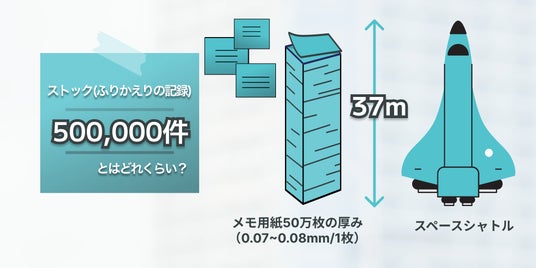 ストックをふりかえりによる気づきを書いたメモと捉え、50万枚のメモを積み重ねると37m(スペースシャトルと同等)の高さになります。