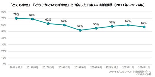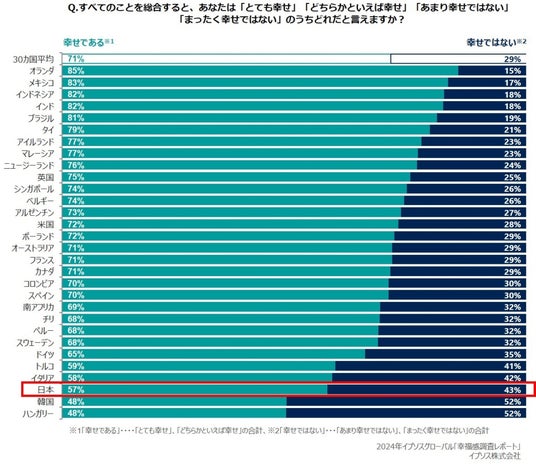 - 「幸せである」と回答した日本人は57%で13年前より13%減少し、30カ国中27位の結果。