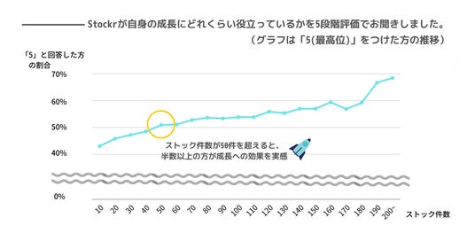 ご利用中のユーザー様を対象に定期的に行っている成長アンケート(Stockrの利用が自身の成長に役立っているかを5段階評価していただくもの)によれば、ストックが50件(投稿)を超えると半数以上の方が5段階中の「5(最高位)」を選択し、以降も件数の増加と「5」の割合がほぼ比例して上がっていく結果が出ています。