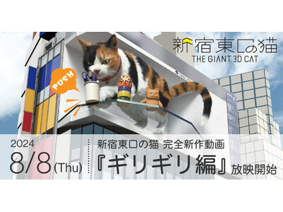 世界を驚かせた3D巨大猫こと『新宿東口の猫』が日々放映される「クロス新宿ビジョン」(運営:株式会社クロススペース)は、この7月で3周年を迎えました。これを記念して、11本目の完全新作映像となる『ギリギリ編』を、8月8日(木)の世界猫の日に放映を開始します。