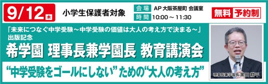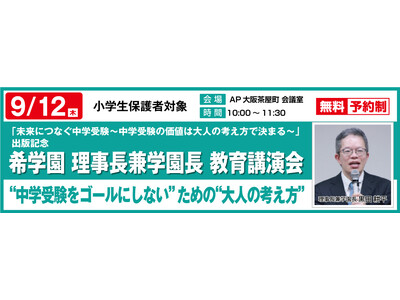 この度、希学園 理事長 兼 学園長 黒田 耕平が執筆いたしました2冊目の著書「未来につなぐ中学受験 ~中学受験の価値は大人の考え方で決まる~」(クロスメディア・パブリッシング)を新たに出版いたします。つきましてはこれを記念し、小学生の保護者の方を対象に下記要領にて