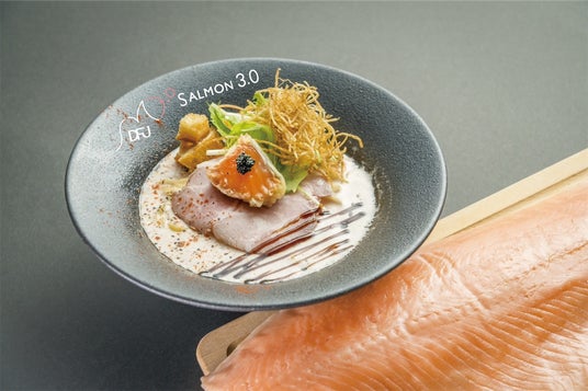 特許技術の分子調理器Dr.Fry 2sの水分量コントロールによって、丸ごと1本仕入れのサーモン全身からジューシーな旨味と上品な風味を引き出し、洗練されたサーモンラーメンを完成させました。