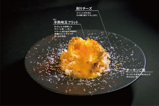 サーモンの旨みで炊き込んだサーモン飯に、Dr.Fry 2sでしか揚げられないとろとろの半熟味⽟フリット、チーズやブラックペッパーをのせた専用ご飯。サーモンスープをかけて贅沢なサーモンリゾットをお召し上がりください。