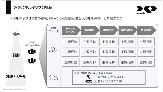 Xpotentialの『AI Sales Coach』の肝は、「自社の”勝ちパターン”としての期待行動」が詰まった「スキルマップ」の活用となります。スキルマップは自社のハイパフォーマーの行動から、営業の勝ちパターンを当社独自のメソドロジーを使い、分析・構造化したものです。これまでに多くの企業様をご支援させて頂いたコンサルティングノウハウが結集されています。