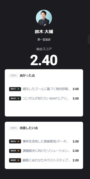 これにより、営業メンバーは商談や架電ごとにフィードバックを受けることができ、日々の営業活動において成長のPDCAサイクルが回ることになります。