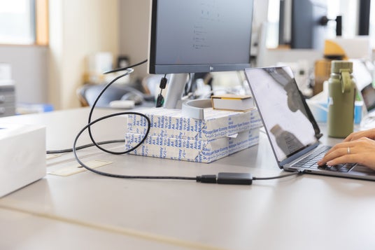 外部モニターの高さを調整するために使用しているのはコピー用紙。このコピー用紙も残置物なのですが、弊社は環境配慮の観点からペーパーレス化を進めており、コピー用紙は基本的に使いません。そのため、このように高さ調整をする台として利活用しています。