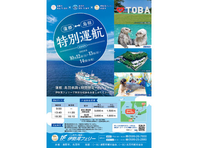蒲郡市市政70周年×鳥羽市市政70周年×伊勢湾フェリー60周年を記念して、かつて蒲郡竹島埠頭から発着していた蒲郡鳥羽航路を3日間限定で特別運航いたします。普段乗船することができない航路を利用し、蒲郡市と鳥羽市両地域の観光と船旅をお楽しみください。