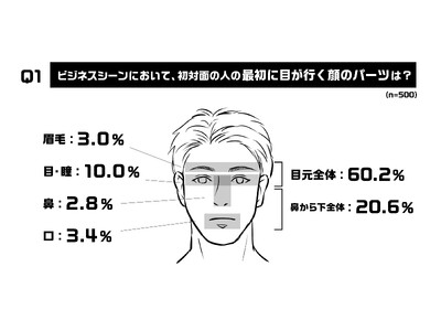 全国の20代~50代の男性500名にビジネスシーンにおいて、初対面の方と会うときに目が行きやすい顔のパーツを質問したところ、1位「目元全体」(70.8%)、2位「鼻から下全体」(39.6%)3位「口」(9.6%)という結果となり、