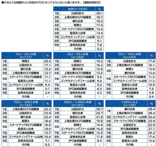会社経営者はどのような経歴の人に自社のCFOになってもらいたいか?1位「公認会計士」2位「上場企業のCFO経験者」3位「銀行出身」4位「税理士」5位「スタートアップのCFO経験者」従業員規模1,000人以上では「銀行出身」と「上場企業のCFO経験者」が同率1位