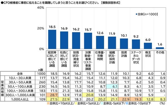 会社経営者がCFO候補者に事前にハッキリ伝えたいと思うことTOP2は「財務状況・資金繰り状況」「決算数値・事業リスク・事業課題」従業員規模1,000人以上では「経営陣に対して感じている課題」が1位