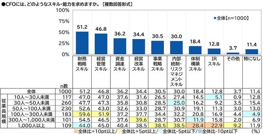まず、全回答者(1,000名)に、CFOには、どのようなスキル・能力を求めるか聞いたところ、「財務戦略スキル」(51.2%)が最も高くなりました。次いで高くなったのは、「経営管理スキル」(46.8%)、「資金調達スキル」(36.2%)、「経営改革スキル」(34.4%)、「事業戦略スキル」(30.5%)でした。