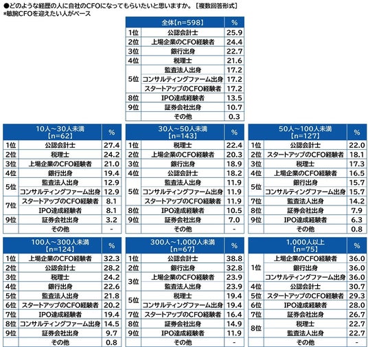 従業員規模別にみると、従業員規模100人~300人未満では「上場企業のCFO経験者」(32.3%)、従業員規模1,000人以上では「上場企業のCFO経験者」「銀行出身」「コンサルティングファーム出身」(いずれも36.0%)がそれぞれ1位でした。
