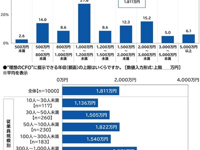 “理想のCFO”に提示できる年収の上限 平均は1,811万円、従業員規模1,000人以上では平均3,180万円