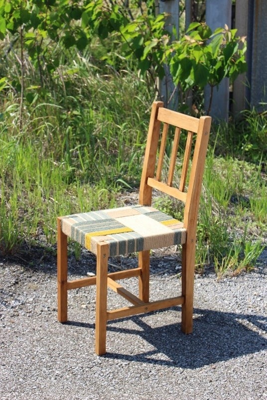 もともとは、とても軽くシンプルな椅子でした。 古くなった座面を外し、柔らかくカラフルな麻糸で織りました。
