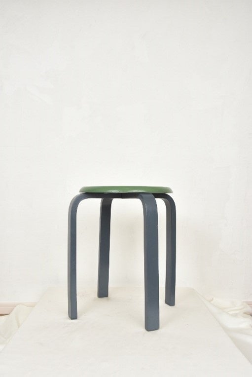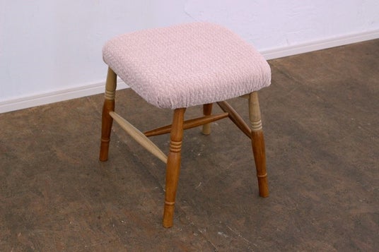 ソファー・椅子の余り布を使用したスツールです。淡いピンクで、少し凹凸のある上品な模様の布。ふわふわした手触りでずっと触っていたくなります。スツールの脚は、修繕過程で使用されなくなったパーツを使用。いろいろな角度から楽しめるカラーにペイントしました。ゆったりと座れる大きさの座面で、さまざまな生活の場面で活躍します。