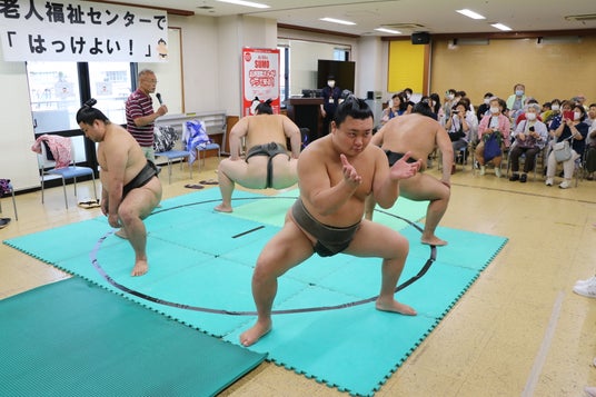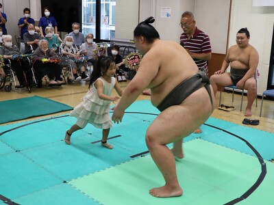 荒川老人福祉センター(荒川区荒川1-34-6)では、猛暑等により外出の自粛が続いている高齢者に社会参加の機会を設けフレイル予防を図ろうと、本日8月30日(金曜)、高砂部屋のお相撲さんを招いて、相撲イベントを開催しました。イベントでは、参加者からの願いをお相撲さんにひとつずつ叶えてもらいました。
